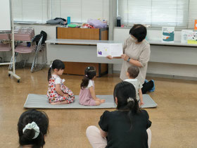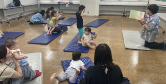 ママのお膝を離れて、子どもたちが絵本のもとへ集まってきました。